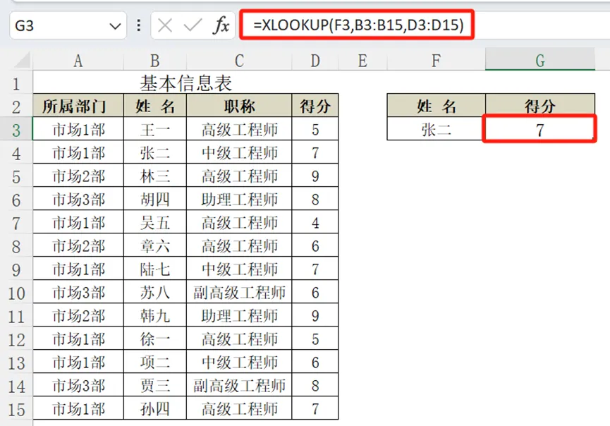 在G3单元格输入公式“=XLOOKUP(F3,B3:B15,D3:D15)”,按Enter键,完成运算,即可即可查找到F3单元格内指定姓名得分,如图B-1所示。