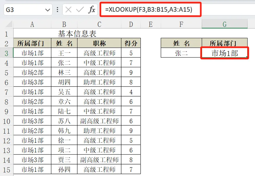 在G3单元格输入公式“=XLOOKUP(F3,B3:B15,C3:C15,"查无此人")”,按Enter键,完成运算,如图B-3所示。