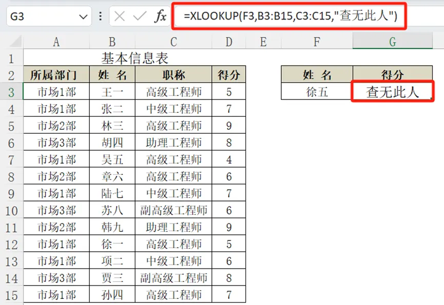 在信息表“姓名”列中,没有查找值“徐五”,指定返回值为“查无此人”。