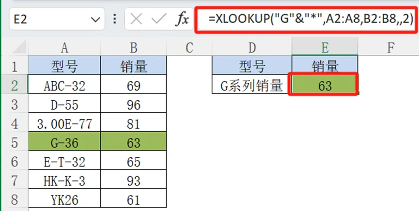 公式中的"G"&"*",表示以“G”开头的型号系列。公式第5个参数为“2”,即按通配符进行数据匹配。
