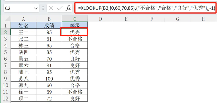 公式中的第5个参数为“-1”,即按完全匹配,如果没有找到成绩对应的等级,则返回下一个较小成绩对应的等级。