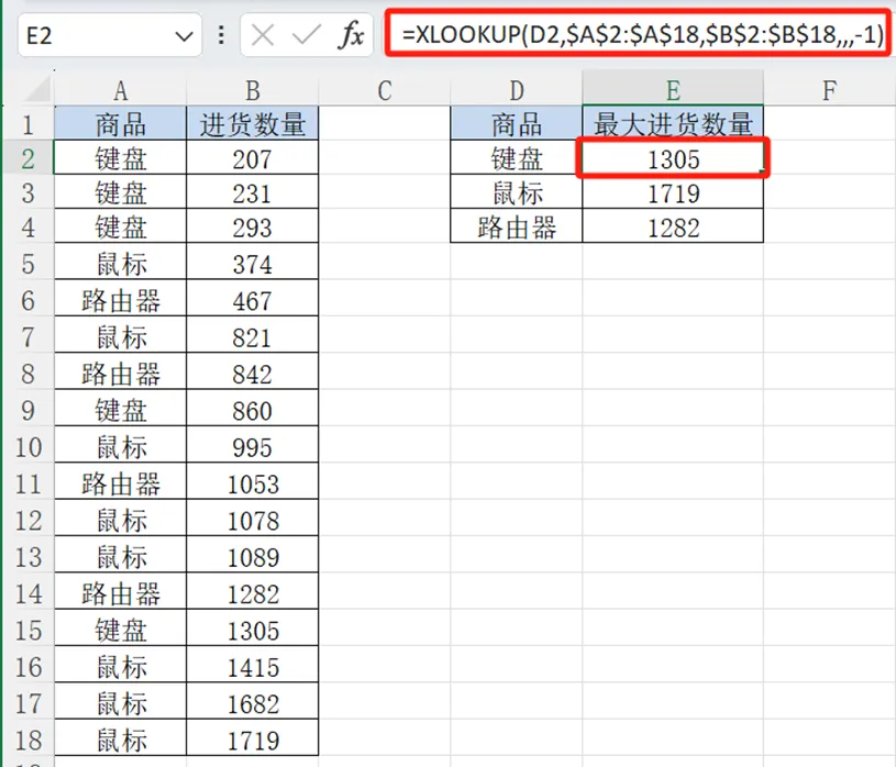在E2单元格输入公式“=XLOOKUP(D2,$A$2:$A$18,$B$2:$B$18,,,-1)”,按Enter键,完成运算,并将公式向下填充,即得所有商品对应的最大进货数量,如图B-6所示。