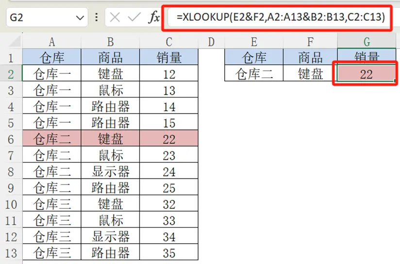 在G2单元格输入公式“=XLOOKUP(E2&F2,A2:A13&B2:B13,C2:C13)”,按Enter键,完成运算,即得指定仓库指定商品的进货数量,如图B-7所示。