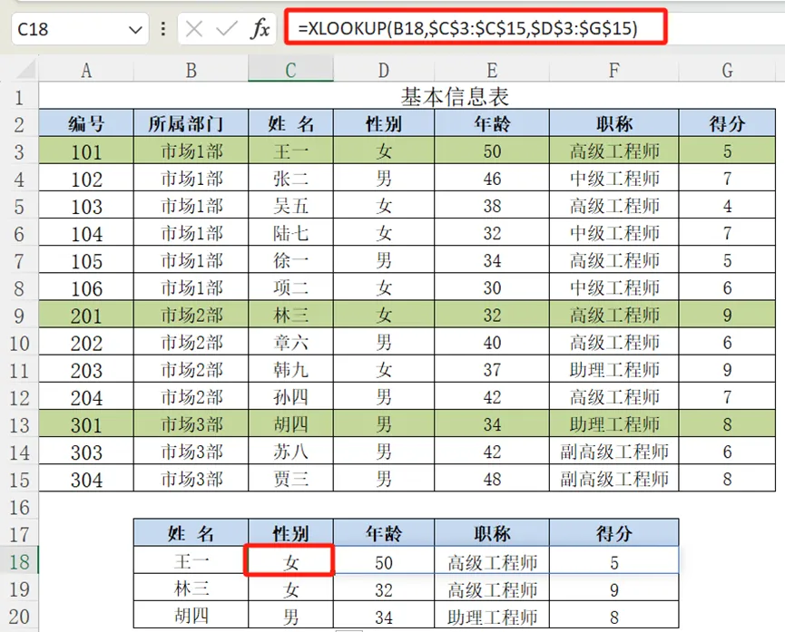 在C18单元格输入公式“=XLOOKUP(B18,$C$3:$C$15,$D$3:$G$15)”,按Enter键,完成运算,即得指定姓名的各项信息,如图B-8所示。