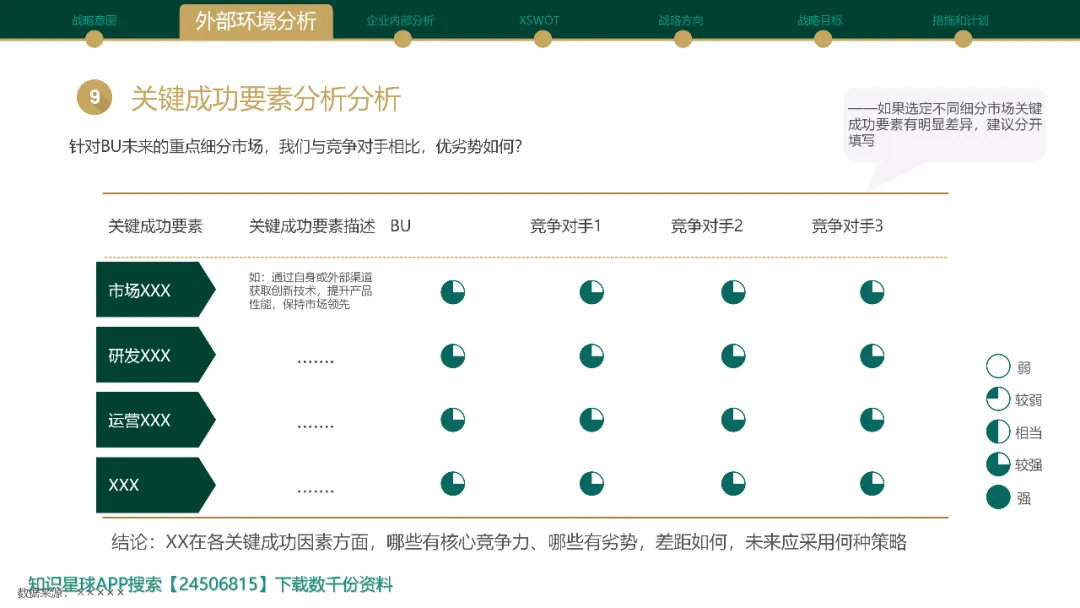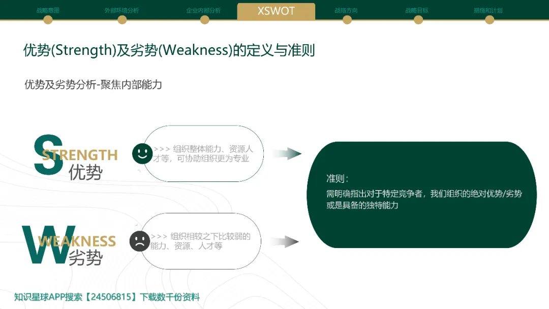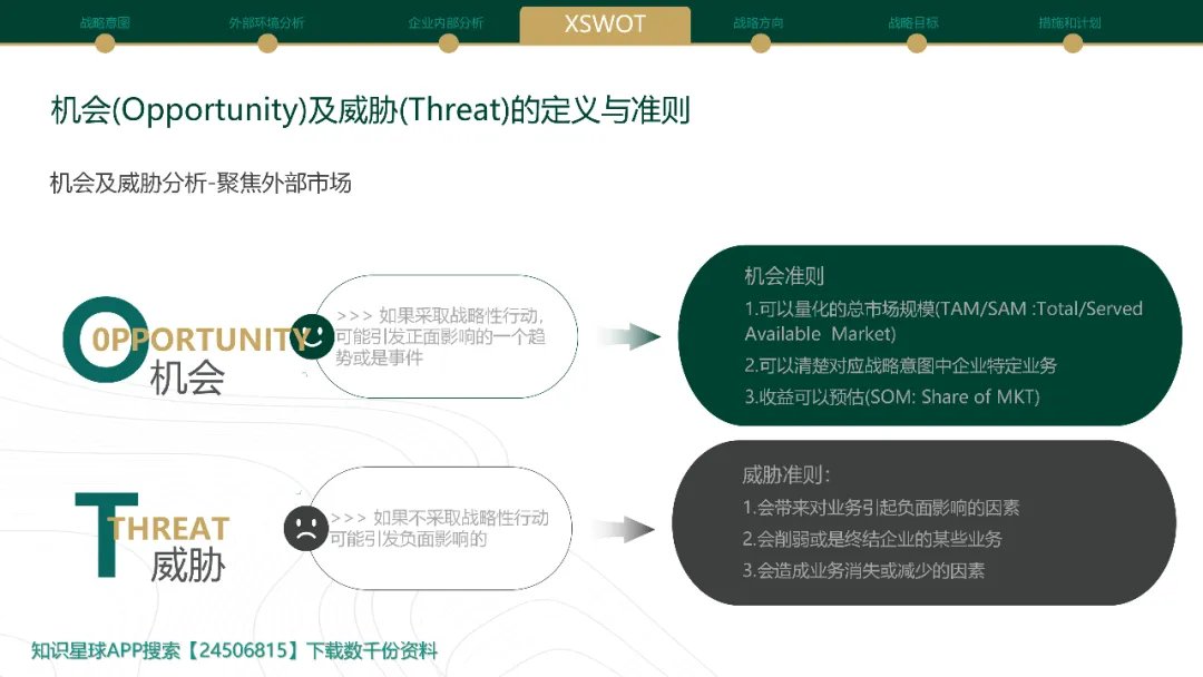 在动态管理的审视环节或战略规划初期,需要强大的分析工具来生成有价值的战略选项。Cross SWOT分析超越了传统SWOT的简单罗列,它通过系统性地交叉匹配内部因素(优势Strengths / 劣势Weaknesses)与外部因素(机会Opportunities / 威胁Threats),激发出更具创造性和针对性的战略构想。其核心步骤包括:1. 详尽列出经过验证的S、W、O、T要素;2. 深度交叉连接:将优势与机会匹配(SO战略:如何利用优势抓住机会?),优势与威胁匹配(ST战略:如何利用优势化解威胁?),劣势与机会匹配(WO战略:如何克服劣势以把握机会?),劣势与威胁匹配(WT战略:如何最小化劣势并规避威胁?)。