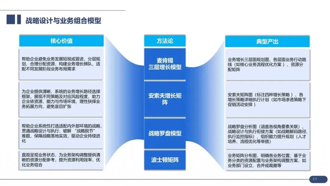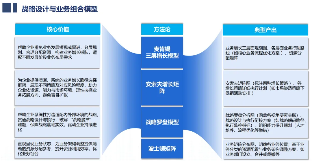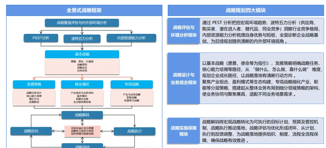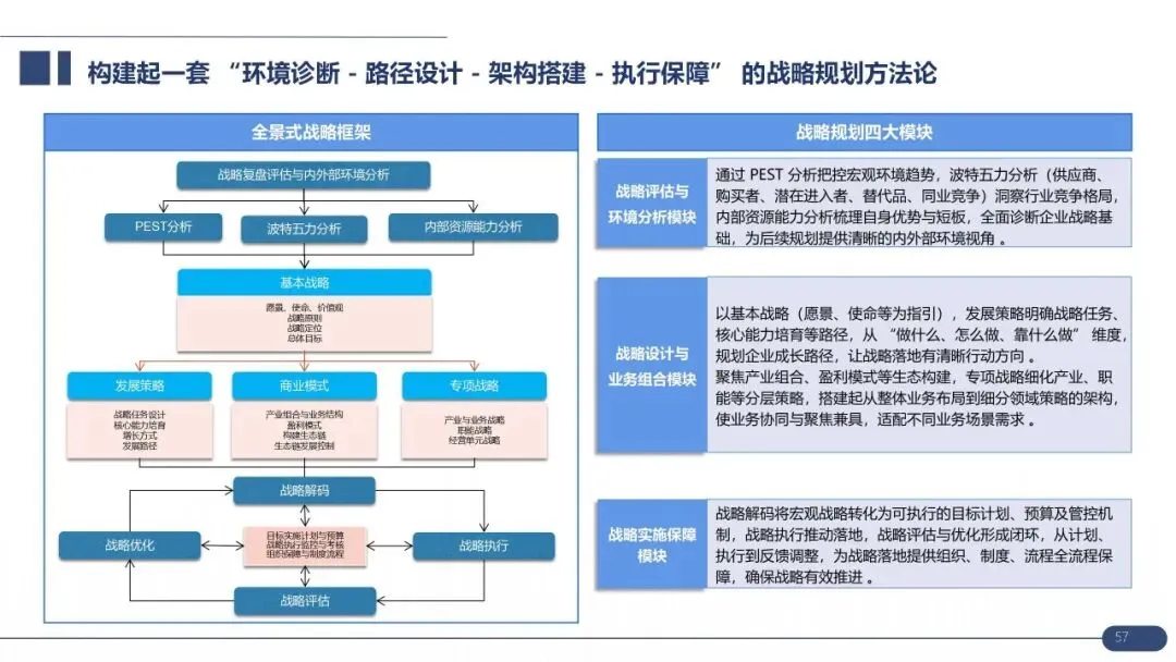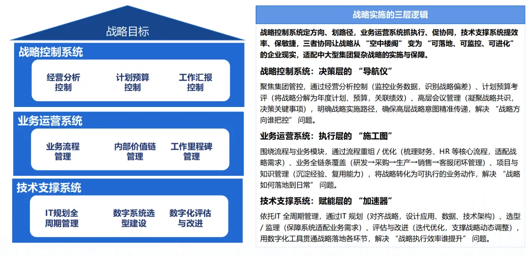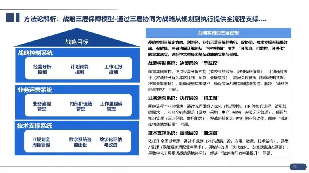 战略三级支撑模式:建立“战略管控体系(集团管控),业务运作体系(业务流程和业务模块),技术支持体系(信息技术规划和数字化)”,形成“决策—执行—赋能”的闭环,为企业的可持续发展提供强有力的支持,为企业的可持续发展奠定坚实的基础。