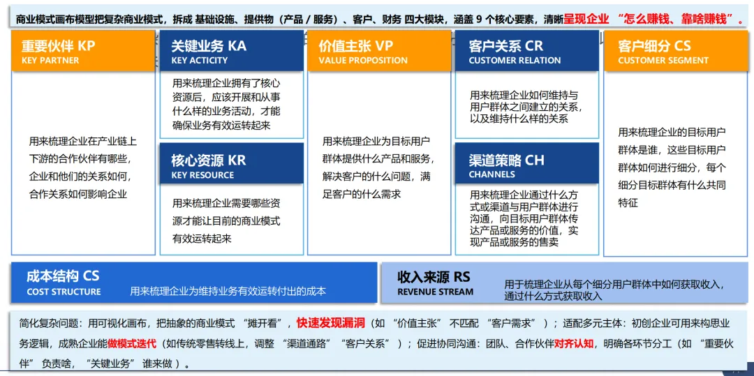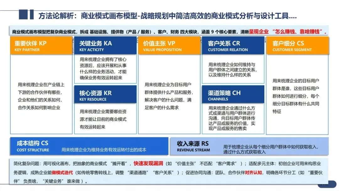 商业模式画布:将其分解为四个模块:架构、产品、客户和财务,包含九大核心元素,将企业的盈利逻辑和价值创造过程直观地展现出来,并与商业逻辑和商业模式的迭代相匹配。