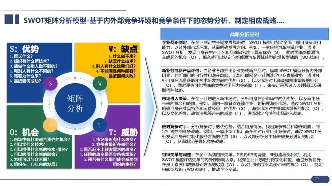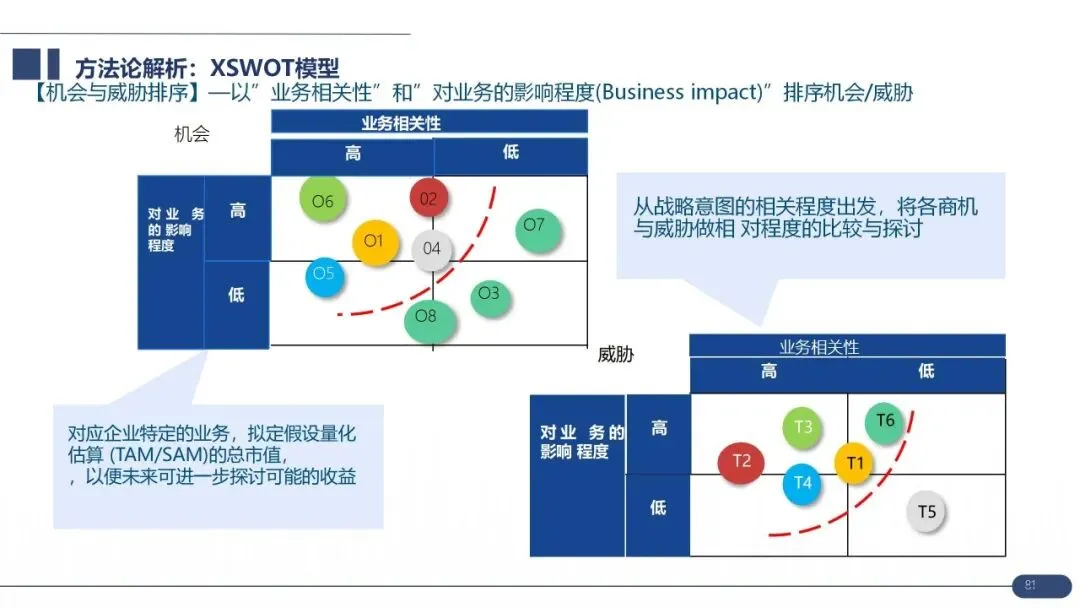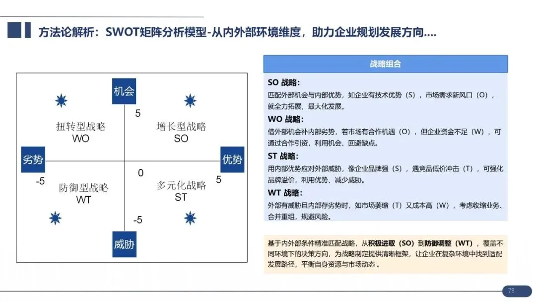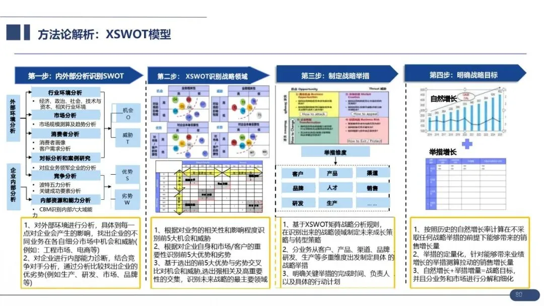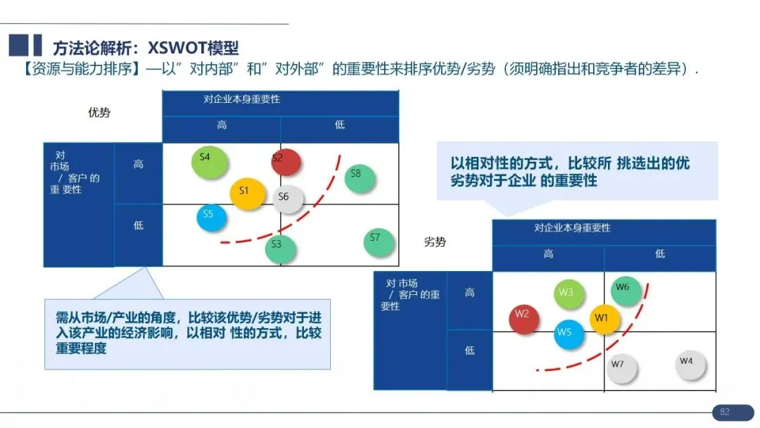 SWOT/XSWOT分析模式:对企业内部的优势、劣势和外部的机会、威胁进行梳理, XSWOT分析模式通过对企业内部的优势、劣势和外部的机会、威胁进行重要性排序和定量分析,准确地定位企业的战略机遇,形成四个主要的战略发展方向。