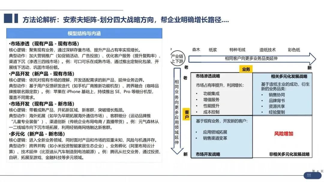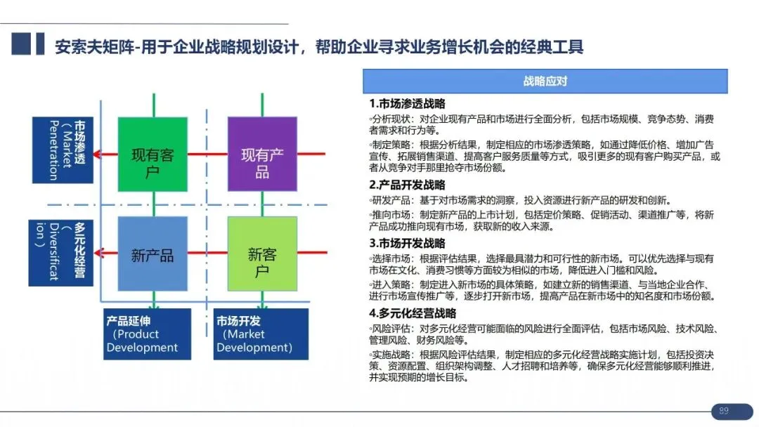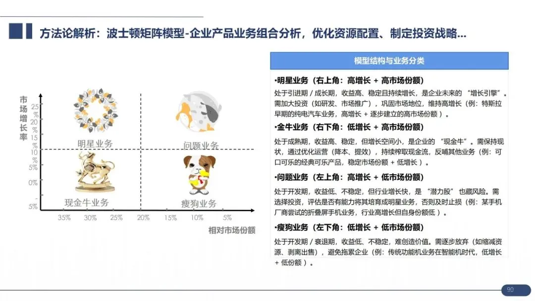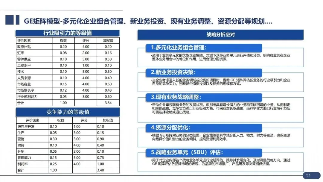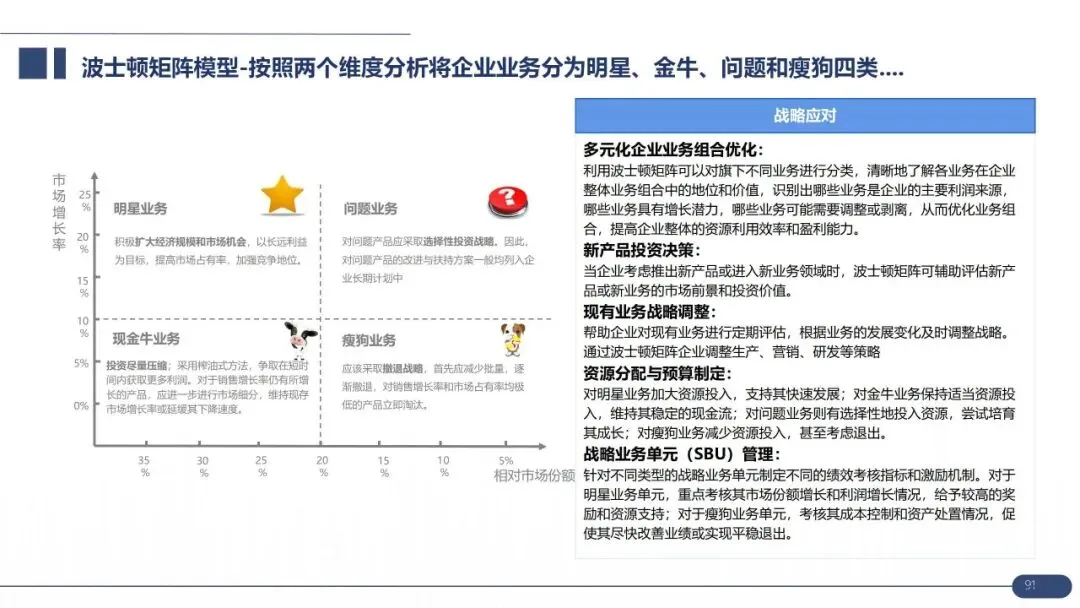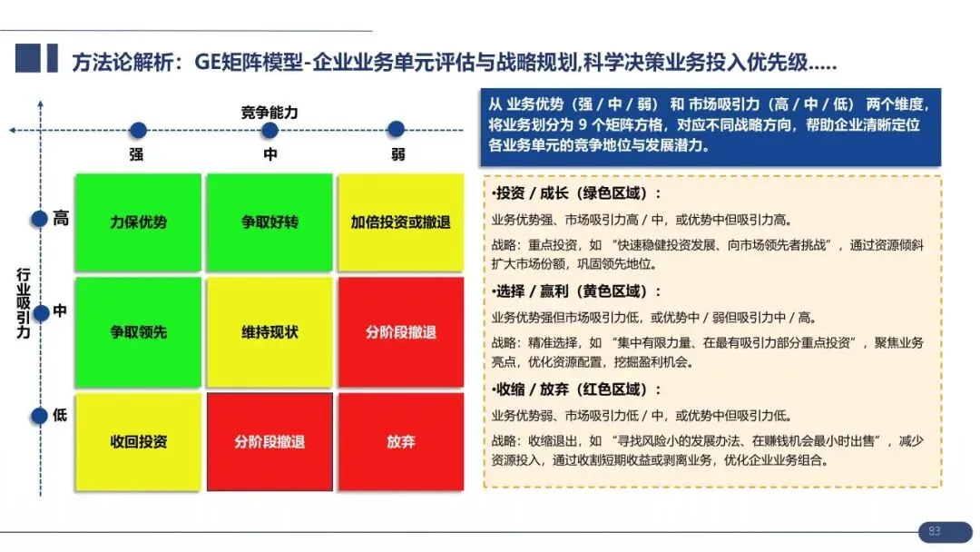 通用电气和波士顿矩阵:通用电气矩阵将企业分为投资成长型、选择盈利型和收缩放弃型三种类型,采用“企业竞争力+市场吸引力”的双维度分析方法,适合于多元化企业的评价;波士顿矩阵以“市场成长率+相对市场占有率”为基础,将企业划分为明星企业、黄金企业、问题企业和瘦狗企业,从而实现企业资源的优化配置和业务组合的优化。
