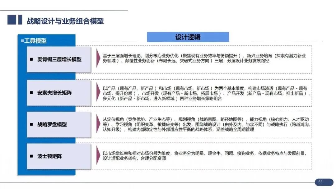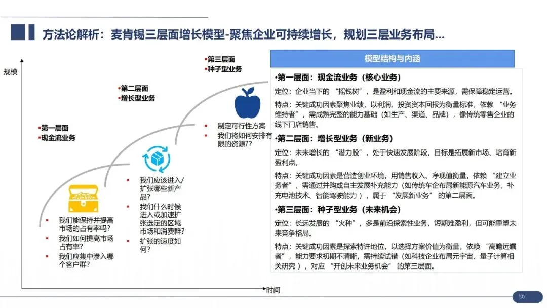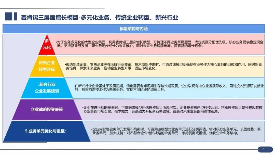 麦肯锡的三层成长模式:将企业分为“现金流型核心企业、成长型新兴企业、潜在型种子企业”,并在此基础上对企业的成长路径和资源进行层次规划。