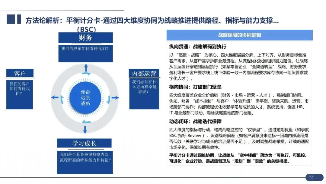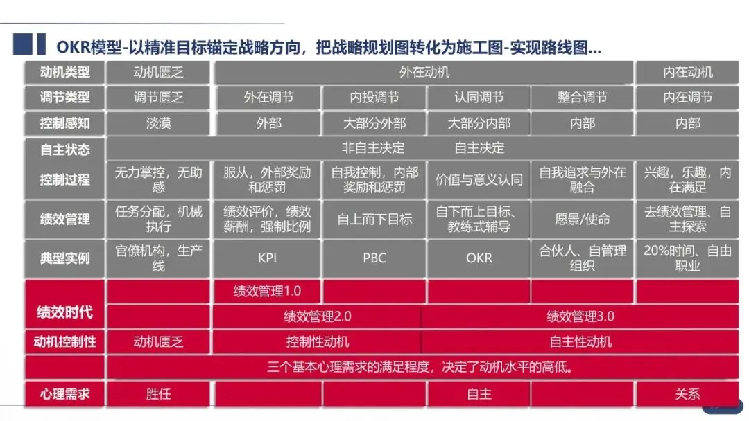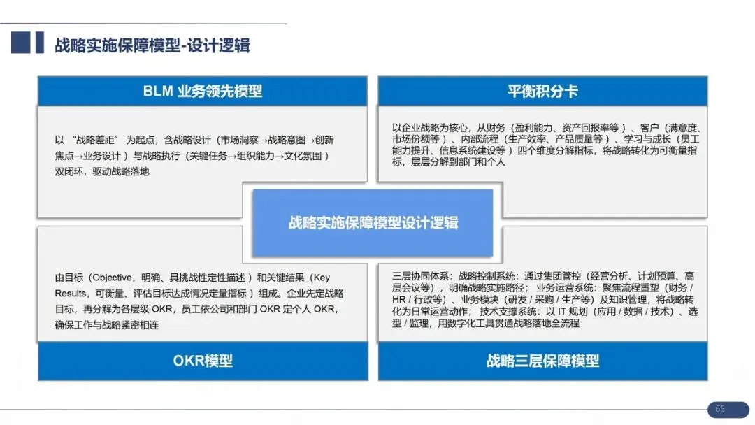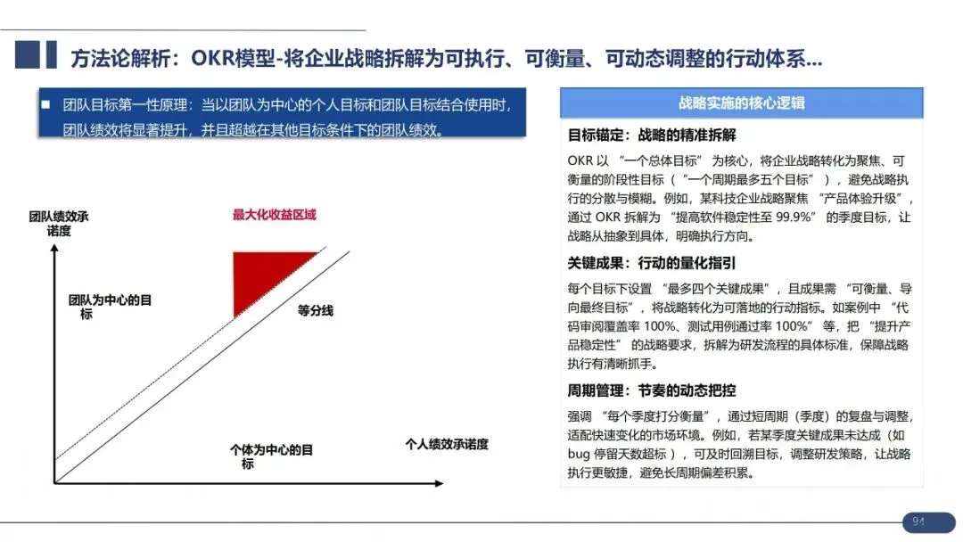 OKR模式:将企业的战略分解成各个层次的可量化行动目标,以“目标+关键成果”为核心,在较短的时间内进行回顾和调整,从而保证战略实施的灵活和精确。