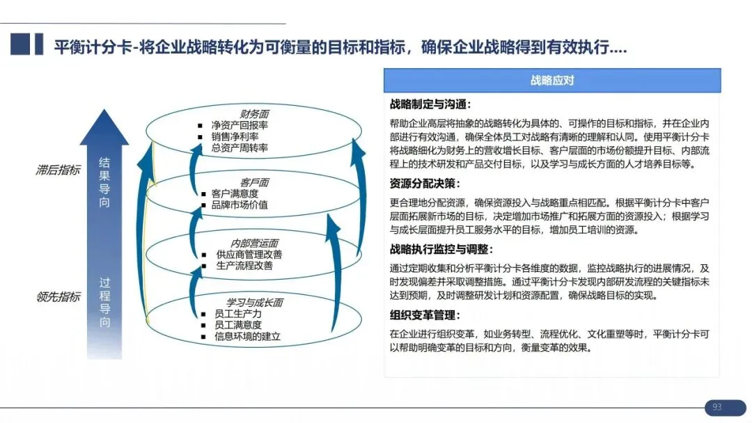 平衡计分卡将企业的战略目标分解为财务目标、顾客目标、内部流程目标和学习成长目标,把抽象的战略目标转变为可测量和可实施的绩效指标,使战略和实施更好地结合起来。