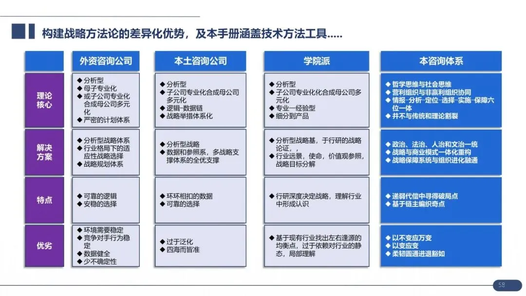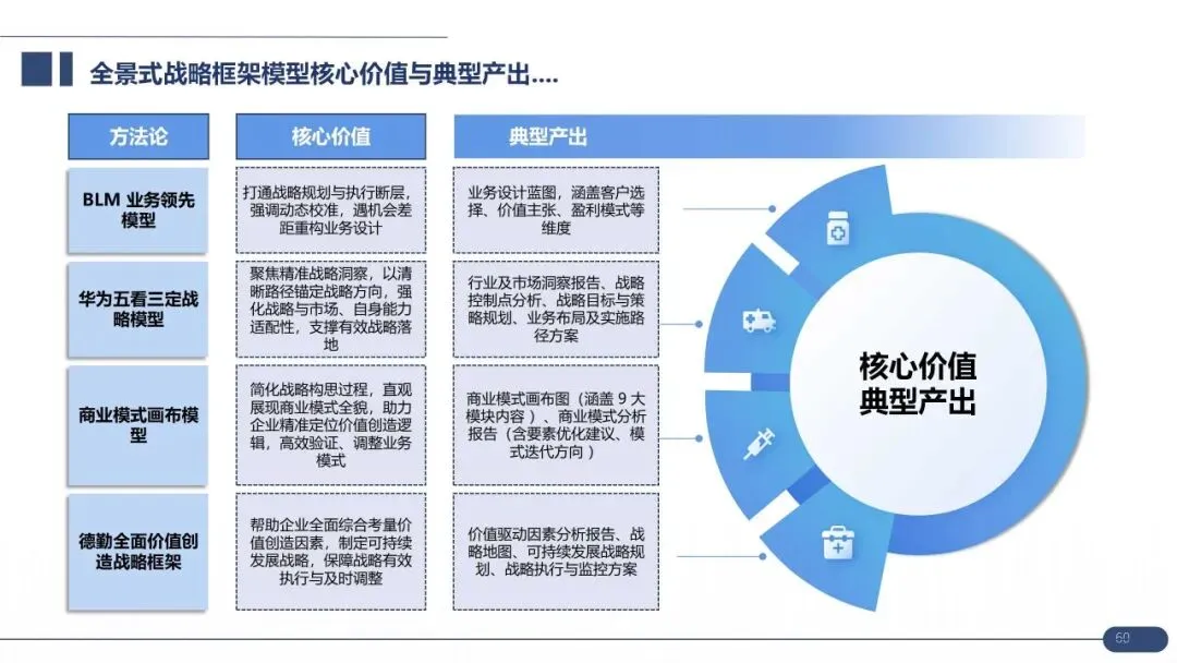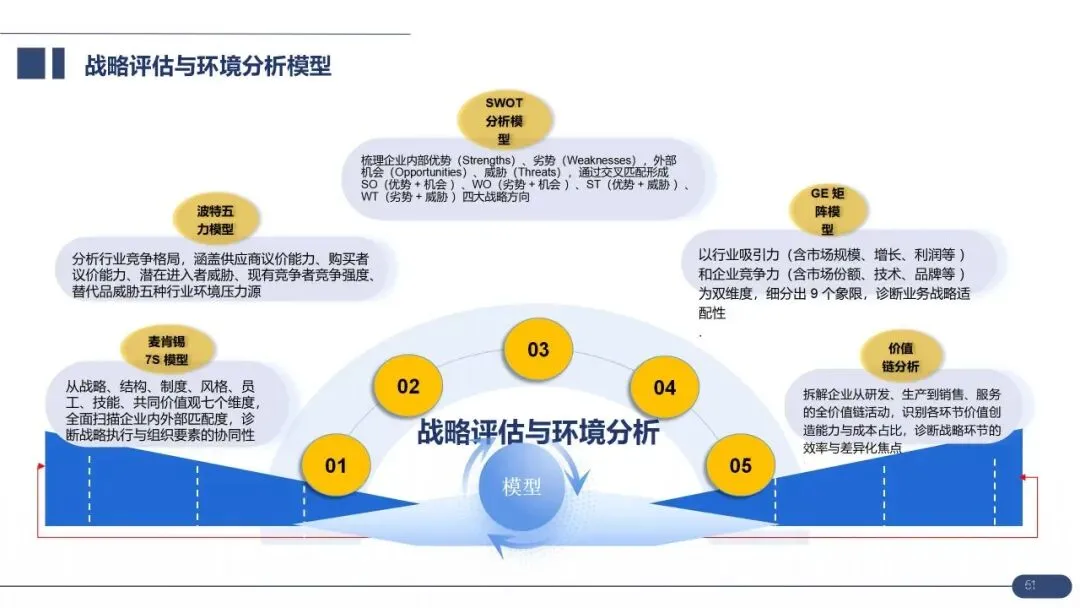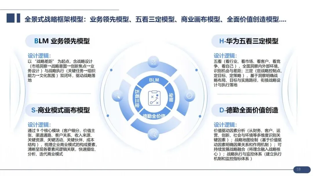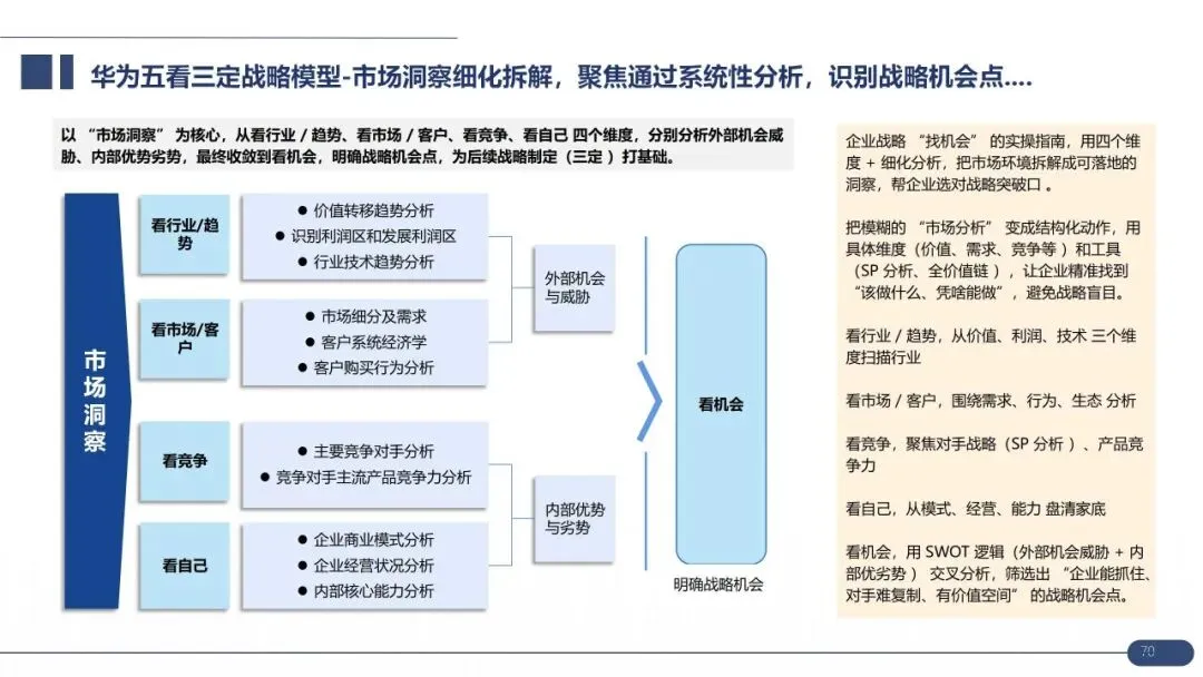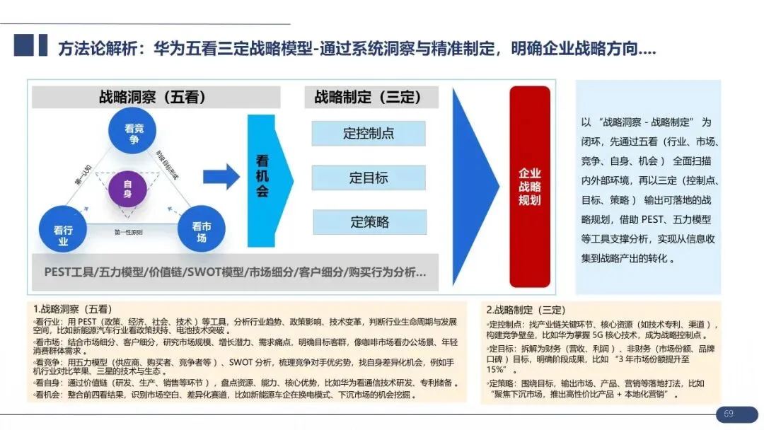 华为的“五看三定”模式:从“行业”、“市场”、“竞争”、“自身”、“机会”四个方面对企业的内外部环境进行全方位的审视,然后从“战略控制点”、“战略目标”、“战略战略”四个方面对企业的战略规划进行落地实施。