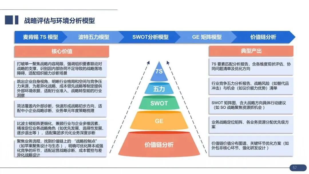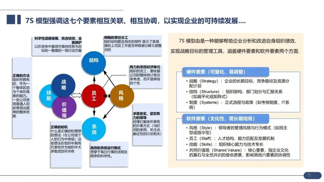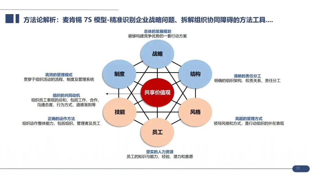 麦肯锡的7 S模式:从战略,结构,制度,风格,员工,技能,共同价值等七个方面,对企业战略实施过程中的组织支持进行分析,找出阻碍企业战略实施的因素,为企业战略的实施提供最佳的组织支持。