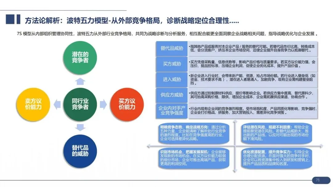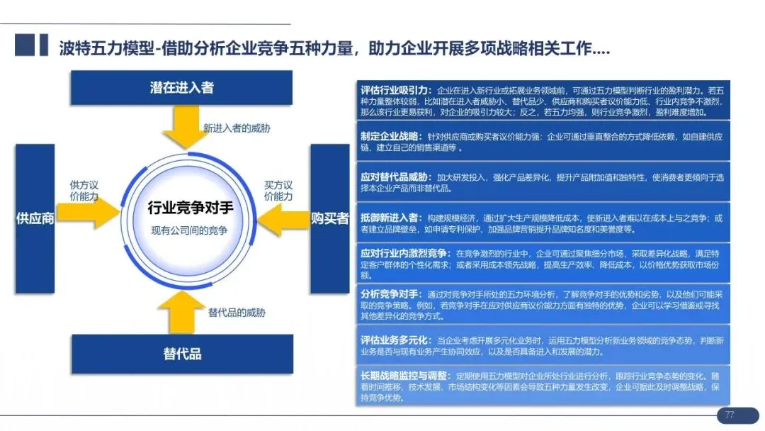 波特五力模型:通过对现有竞争者,潜在进入者,替代品,供应商议价力,买方议价力的分析,明确产业的竞争格局和利润率。