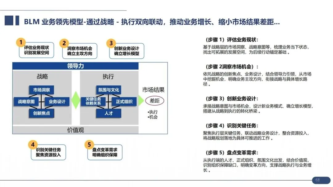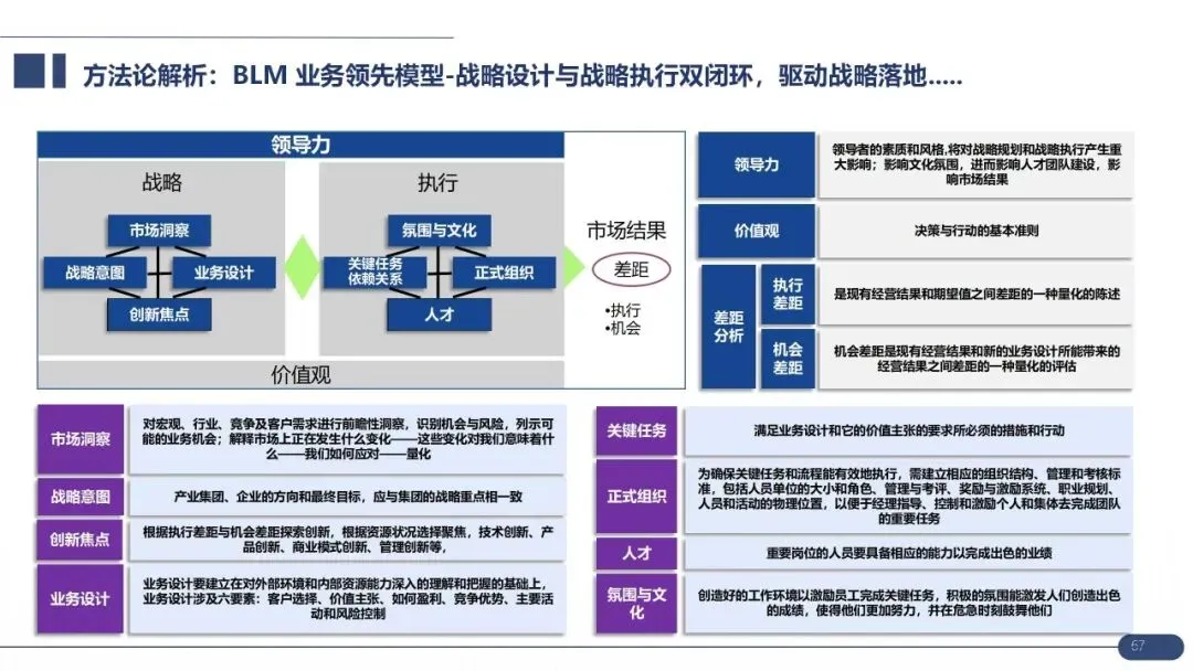BLM商业领先模式:从“战略差距”出发,建立“市场感知—战略意向—创新重点—商业设计”的战略闭环和“关键任务—组织能力—文化氛围”的实施闭环,打通战略策划与实施的断层,从而使企业在竞争中处于主动地位,在竞争中立于不败之地。