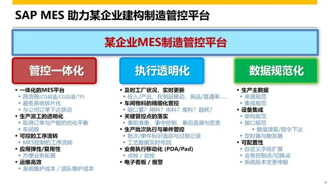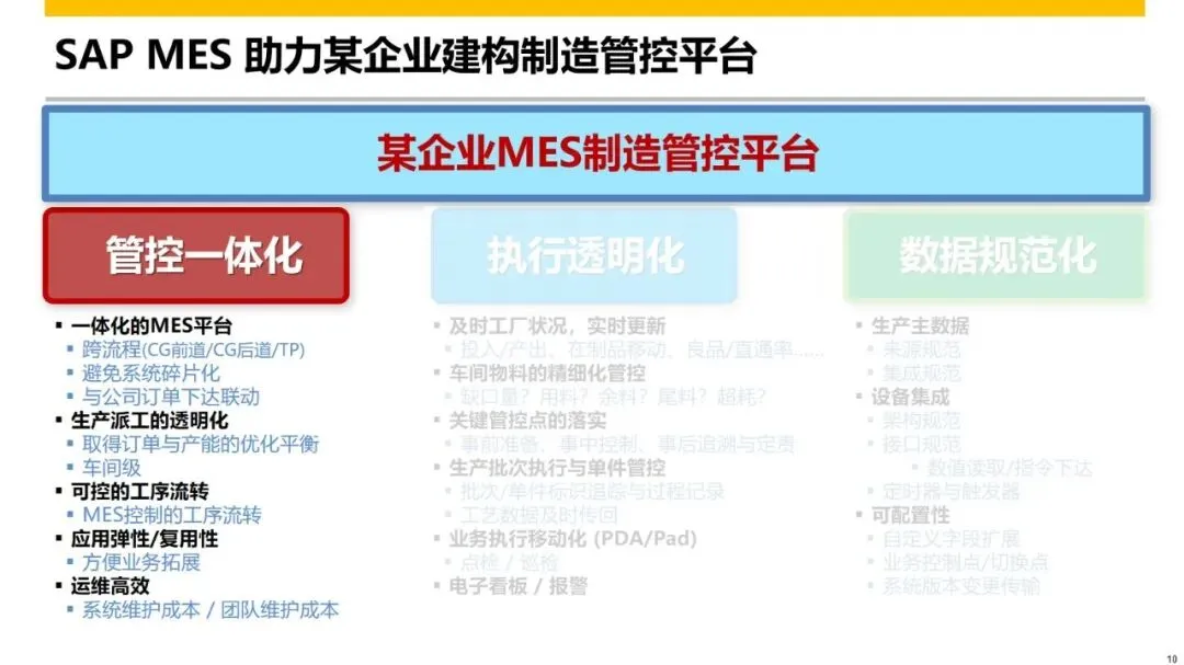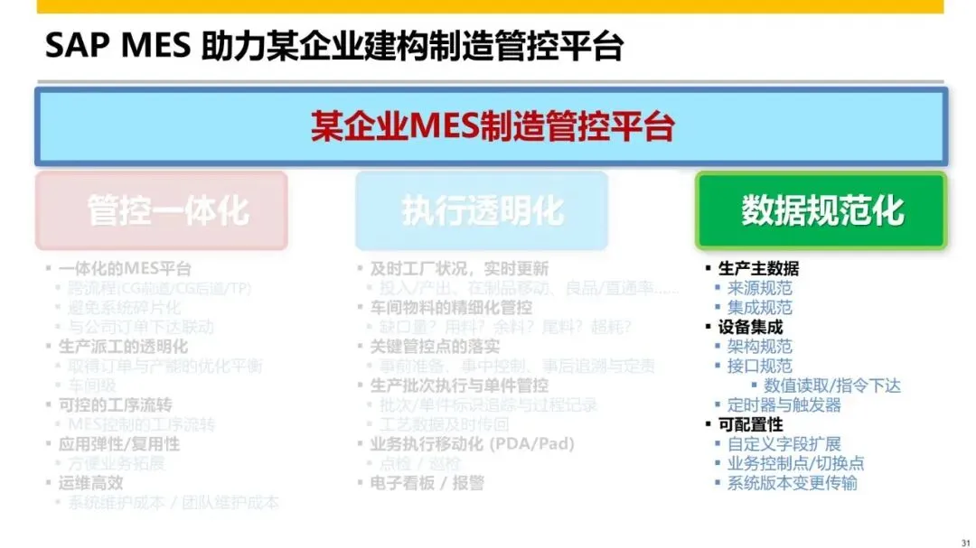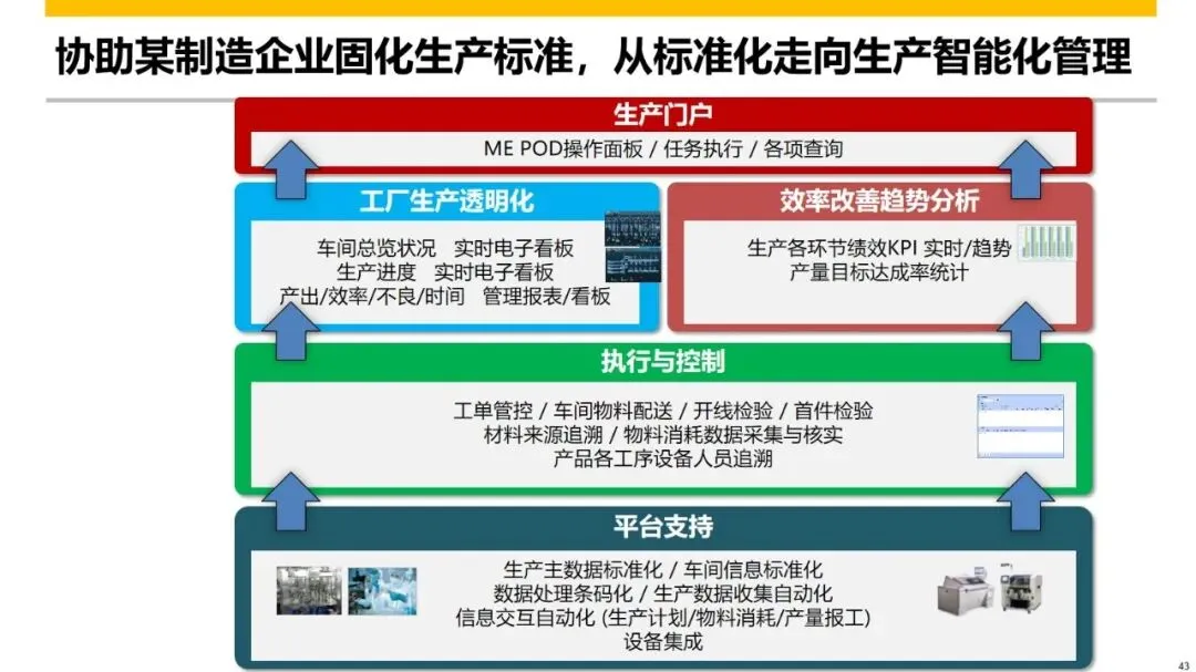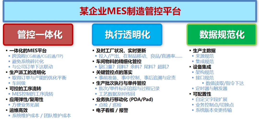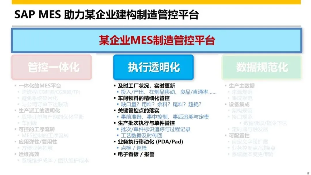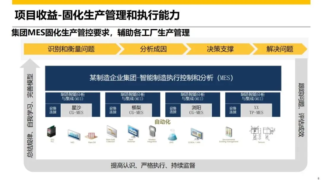 方案以“管控一体化”、“执行透明化”和“数据标准化”为核心,建立了“管控一体化”和“数据标准化”的管理体系。控制与控制集成:构建了跨越过程的协作平台,消除了系统的碎片化,使作业调度更加透明、过程流动更加可控,并具有应用的灵活性和运行维护的效率;执行透明:通过对工厂状态的实时更新,物料工具的精细化管理,质量控制点的落实,可追溯性的强化,以及行动化的执行与电子看板的提醒,实现对生产动态的全面控制;数据的规范化:规范了主数据的获取和整合的规范,保证了设备的高效整合和能量资料的准确收集,保证了资料的流畅流动。