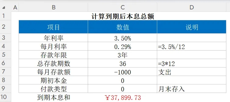 =FV(3.5%/12,3*12,-1000,0)函数解析:每月利率为3.5%/12,投资期数为3年*12月,每月月末投入1000元,初始现值为0元,计算该投资3年后的总价值为37899.73。=PV(每期利率, 总期数, 每期支付额, [未来值], [期初或期末])