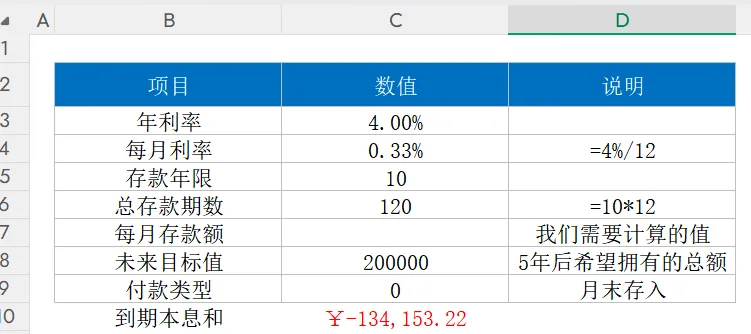 =PV(4%/12,10*12,0,200000,0)函数解析:计算在月利率4%/12下,为了10年后得到20万,当前需要一次性投入的总金额是13.4万。=NPER(每期利率, 每期支付额, 现值, [未来值], [期初或期末])