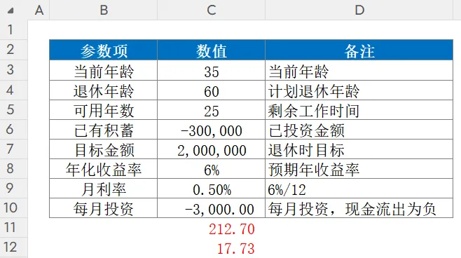 =NPER(6%/12,-3000,-300000,2000000)函数解析:计算在月利率6%/12下,每月定投3000元,在已有30万存款的基础上,要17.73年才能达到200万元(未来值)。=RATE(总期数, 每期支付额, 现值, [未来值], [期初或期末])