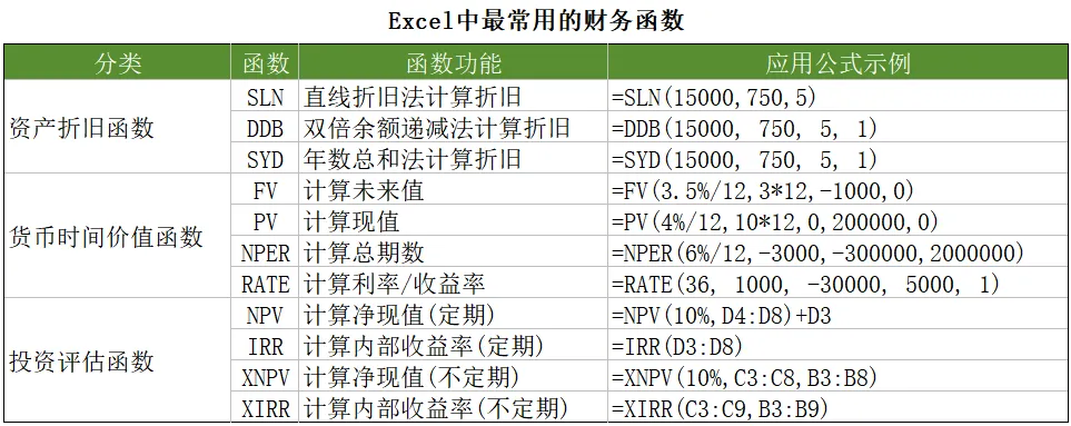 =IRR(D3:D8)函数解析:计算定期现金流的内部收益率约为13.47%,高于10%(预期收益率是10%),说明该项目可行。=XIRR(现金流范围, 日期范围, [猜测值])