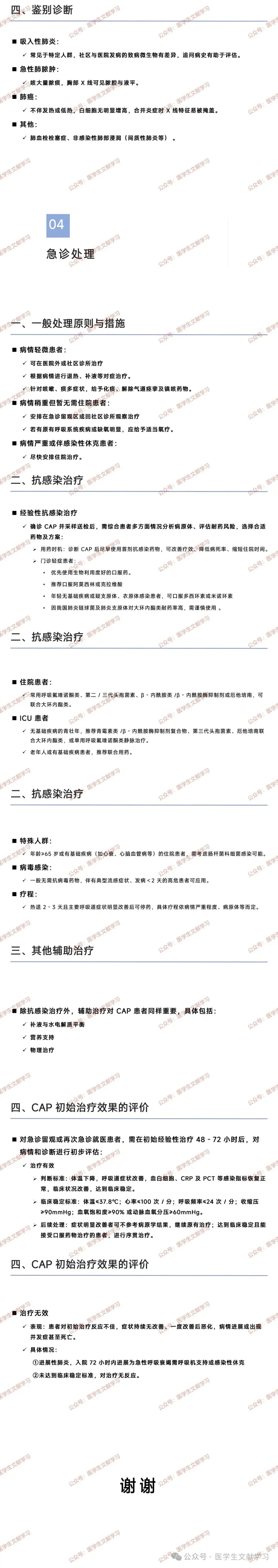 CAP 初始治疗效果的评价:治疗 48 - 72 小时后评估,治疗有效表现为体温下降等,达到临床稳定标准可继续原有治疗或序贯治疗。治疗无效表现为症状无改善或恶化,可能出现进展性肺炎等情况。