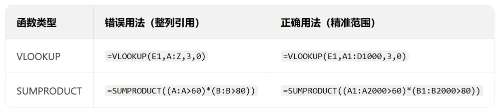 VLOOKUP、SUMPRODUCT等函数需要逐行遍历数据计算,如果你用“整列引用”(如A:Z),哪怕表格只有1000行数据,函数也会默认遍历几万行空白单元格,卡顿可想而知。如果需要预留数据增长空间,范围设为实际数据量的1.5-2倍即可(比如5000行数据,设为A1:D8000),无需直接引用整列。六、善用辅助列:拆解复杂计算