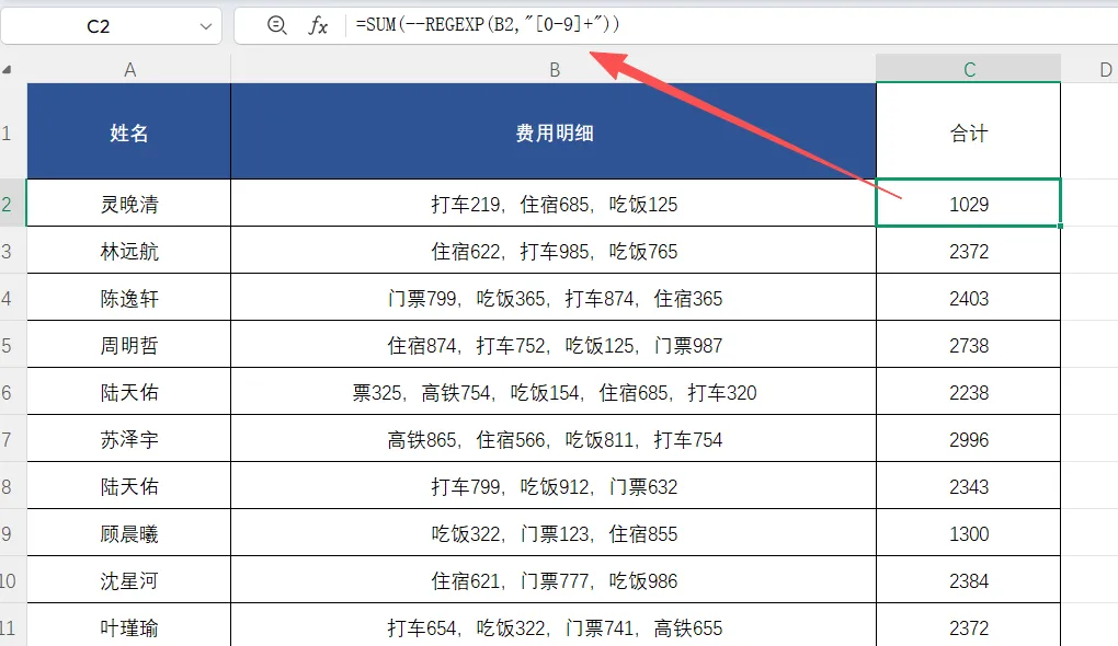 =SUM(--REGEXP(B2,"\d+")),向下填充即可获取结果。