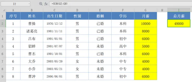 选中I2单元格,并在编辑栏输入函数公式:=SUM();然后用鼠标选中G2:G9单元格区域,按回车键结束确认,即可计算出所有员工的月薪总和;