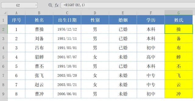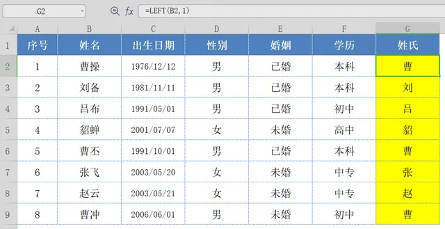 LEFT函数,用于截取文本中左侧的字符串,通过LEFT函数,可以返回:所有员工的姓氏;