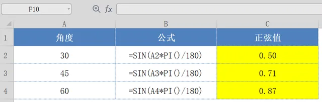 SIN函数:=SIN(A2*PI()/180);