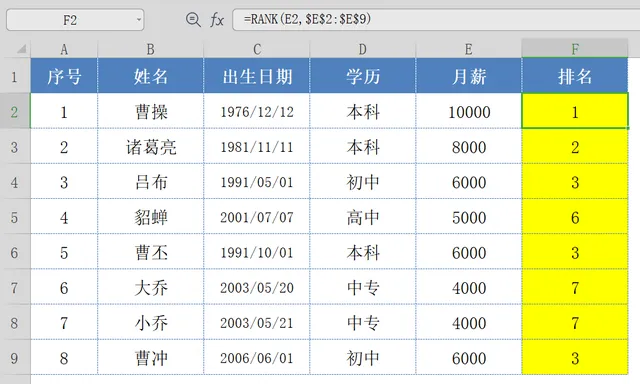 RANK函数;用于返回指定单元格值的排名,我们选中F2:F9单元格区域,并输入RANK函数公式,然后按Excel快捷键【Ctrl+Enter】,即可返回月薪排名;