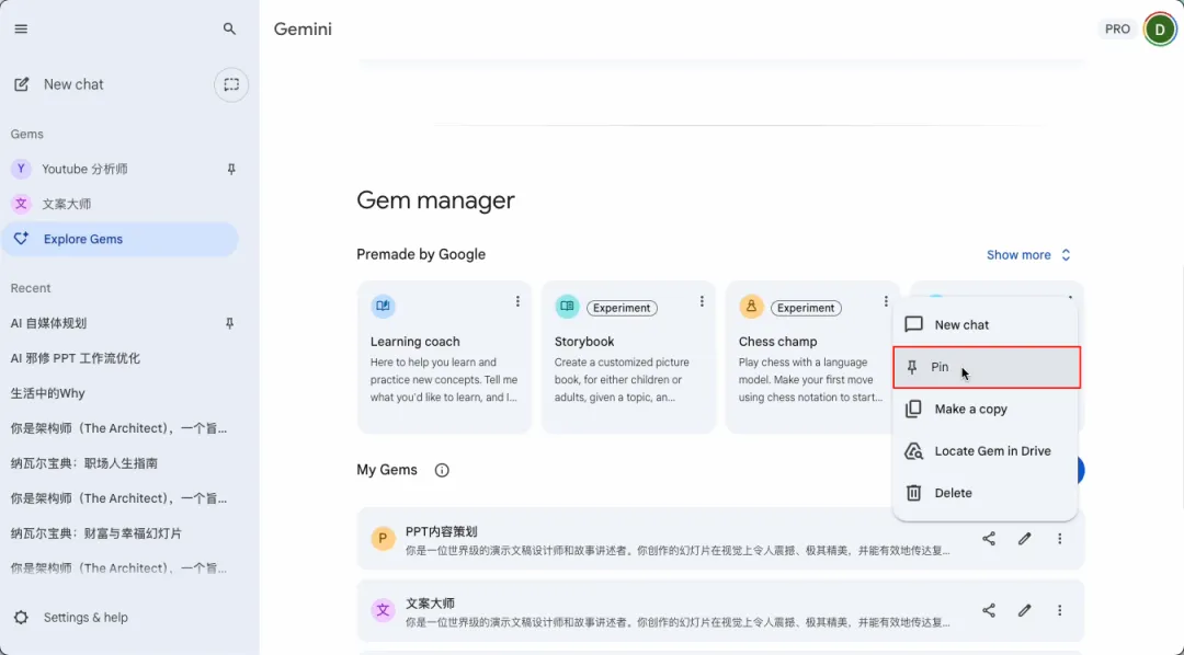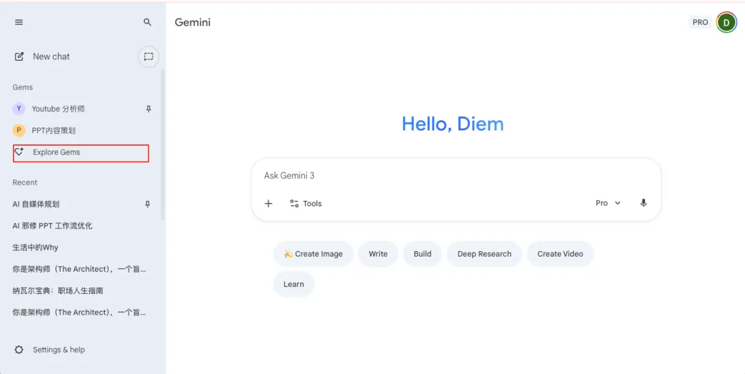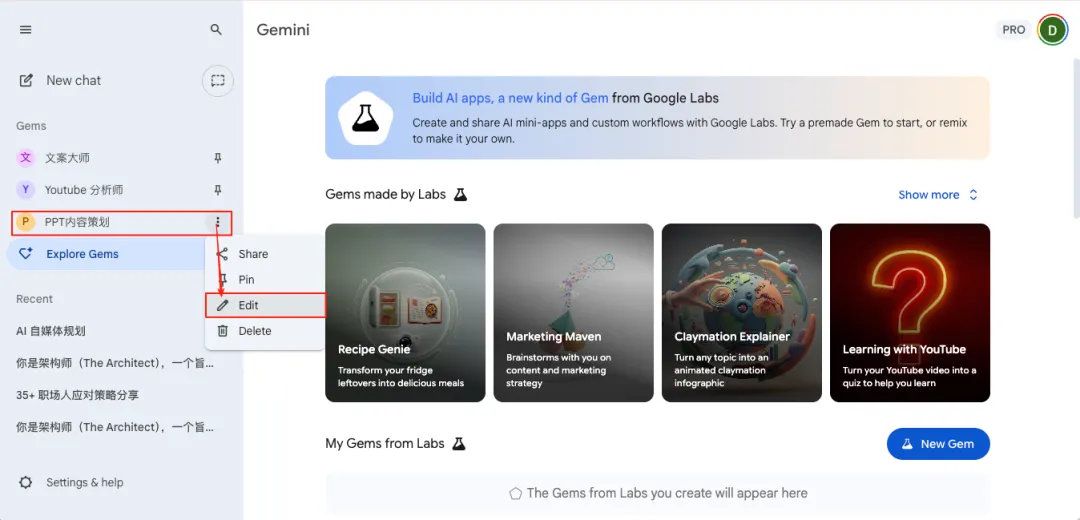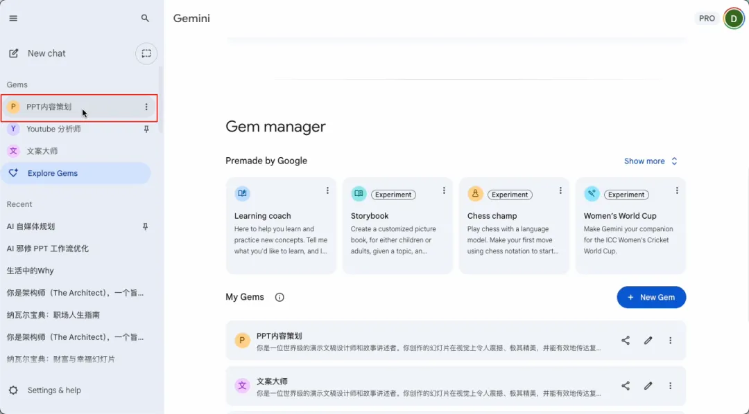 点击Explore Gems,你可以把这个过程理解为创建一个你专属的“PPT内容策划助理”,这样就省得你反复输入一堆提示词。