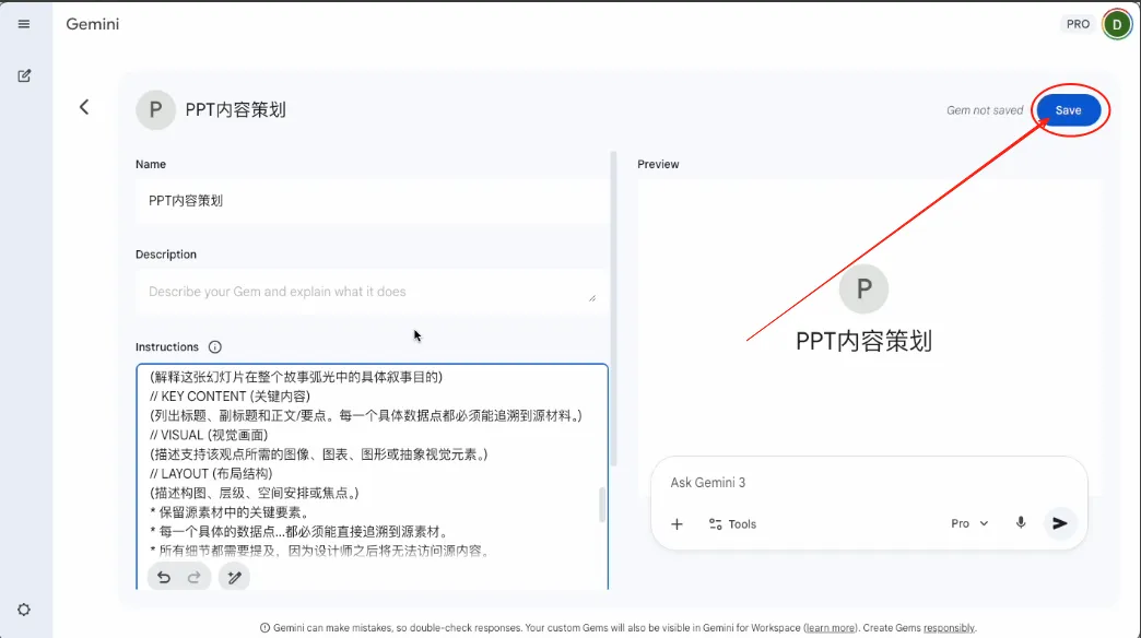 Instructions: 写给 AI 的“岗位手册”:告诉AI要做什么、不能做什么。这是 Gem 的灵魂,决定了它聪不聪明。