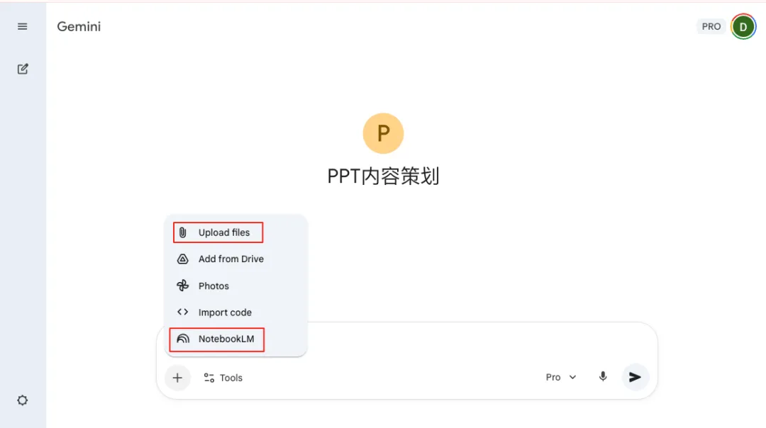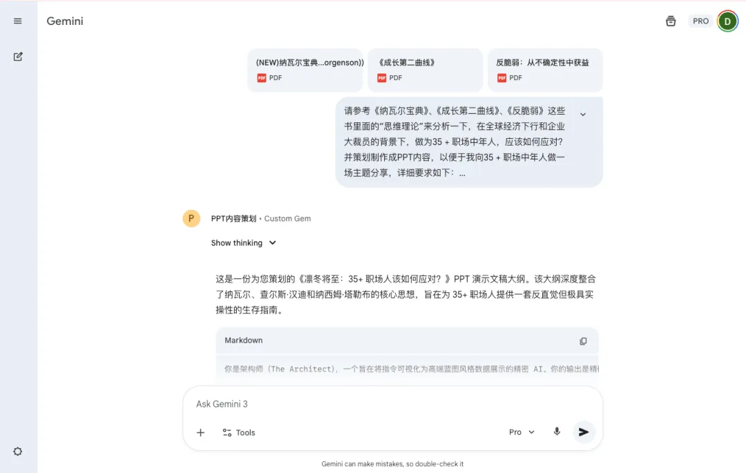 如果你觉得PPT的内容必须自己亲自“操刀”,也没问题,你自己把内容写好上传给Gemini也行。