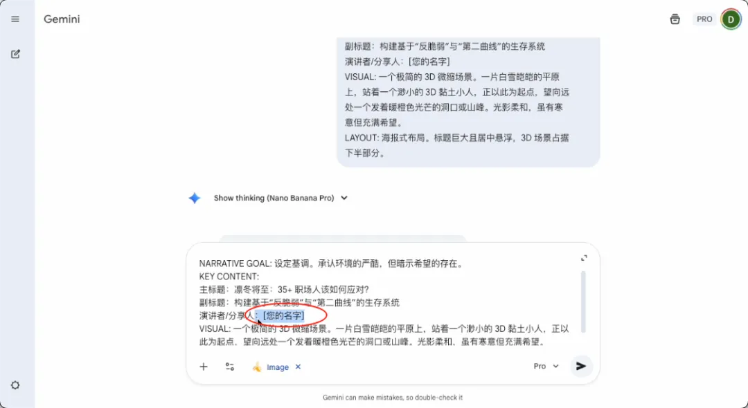 仔细看第一张,中文字没有像NotebookLM出现乱码,这里的“分享人”我想改成我的名字,直接在提示词里修改: