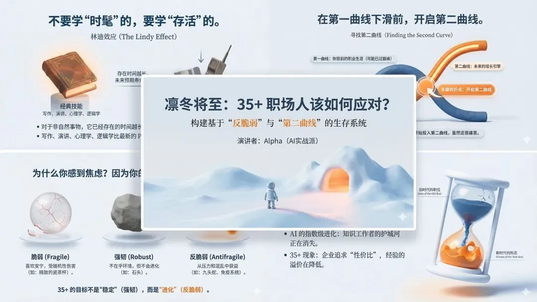 请参考《纳瓦尔宝典》、《成长第二曲线》、《反脆弱》这些书里面的“思维理论”来分析一下,在全球经济下行和企业大裁员的背景下,做为35 + 职场中年人,应该如何应对?并策划制作成PPT内容,以便于我向35 + 职场中年人做一场主题分享,详细要求如下: