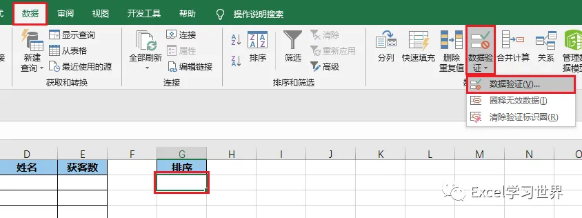 2. 选中 G2 单元格 --> 选择菜单栏的“数据”-->“数据验证”-->“数据验证”