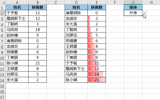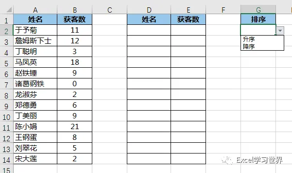 下图 1 是公司销售人员的获客统计表,请制作一个定义排序规则的下拉菜单,一点就能按要求自动排序。