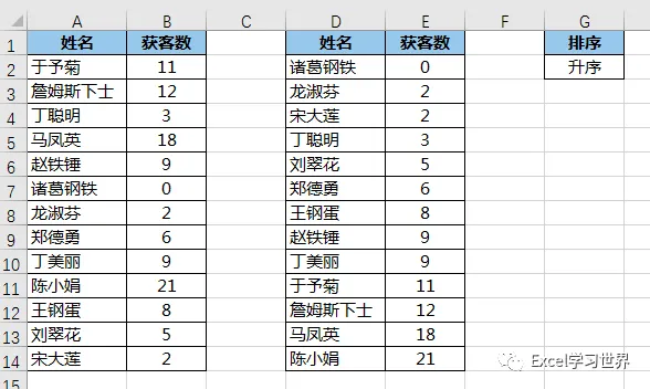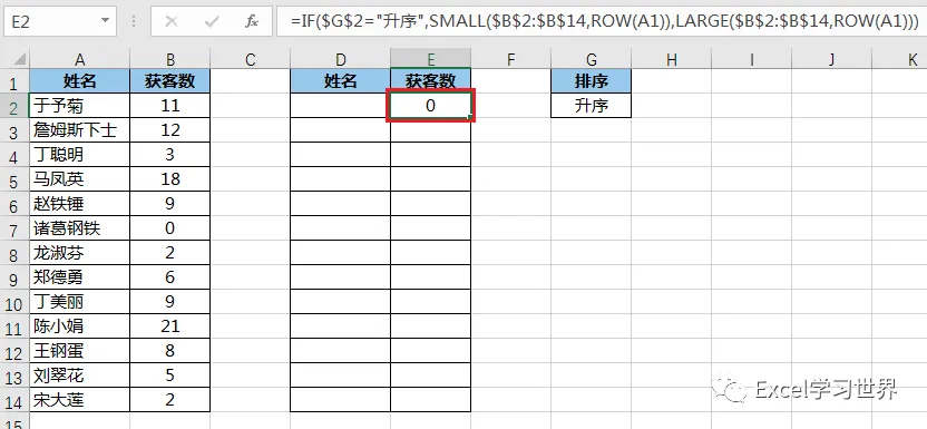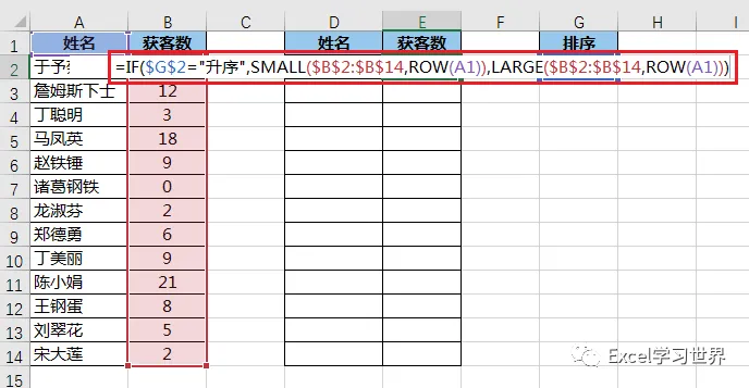 =IF($G$2="升序",SMALL($B$2:$B$14,ROW(A1)),LARGE($B$2:$B$14,ROW(A1)))