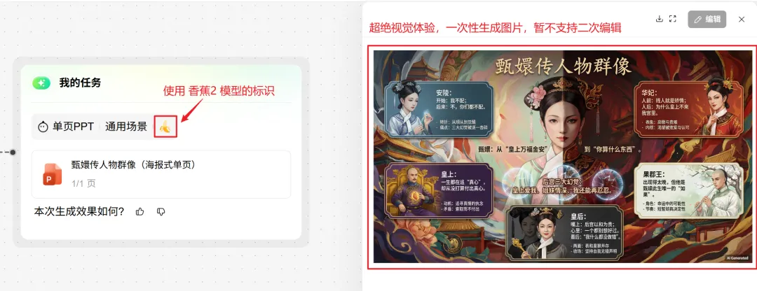 看个例子,这是它一键生成的《甄嬛传人物群像》的海报式单页PPT: