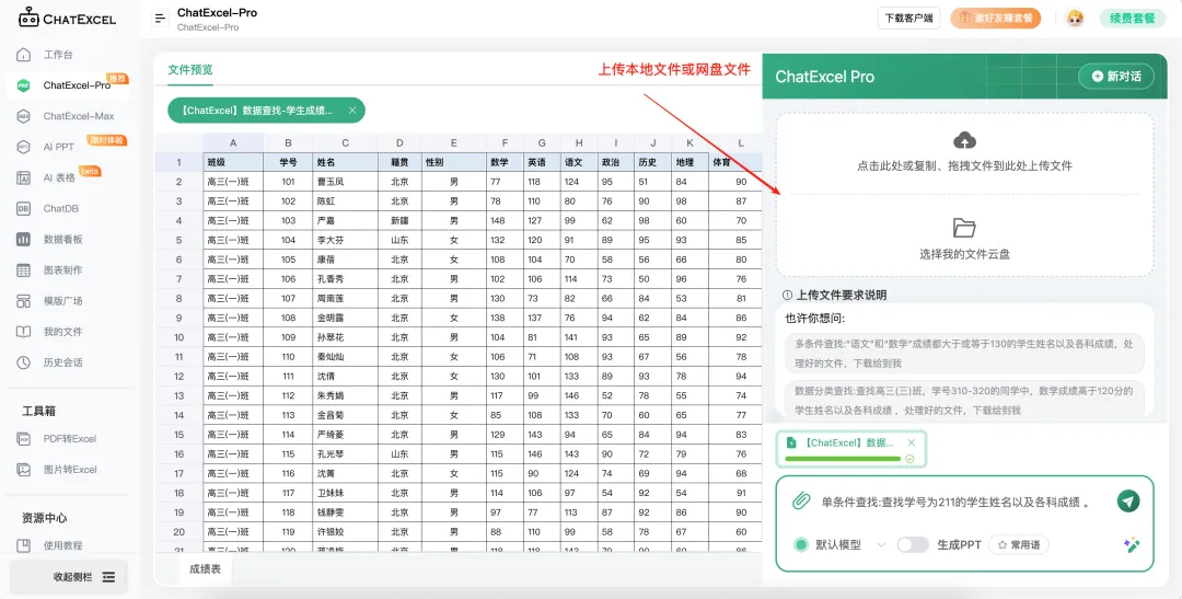 打开ChatExcel官网(chatexcel.com),点击“开始免费使用”进入工作台,可以直接拖拽本地Excel文件(支持.xlsx、.csv格式)上传,也能上传云盘中的文件。系统会自动解析文件,在预览区显示内容,我们可以检查列名和数据类型是否识别正确,有异常可手动调整列属性。