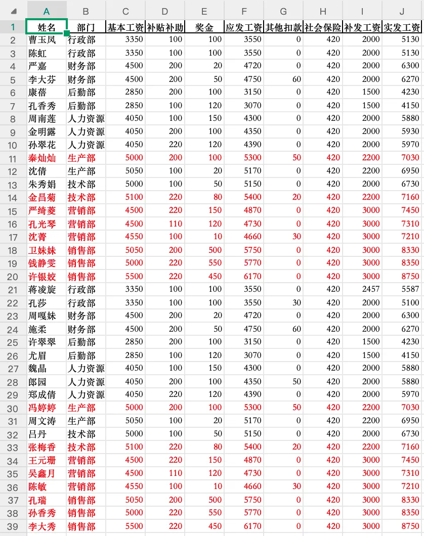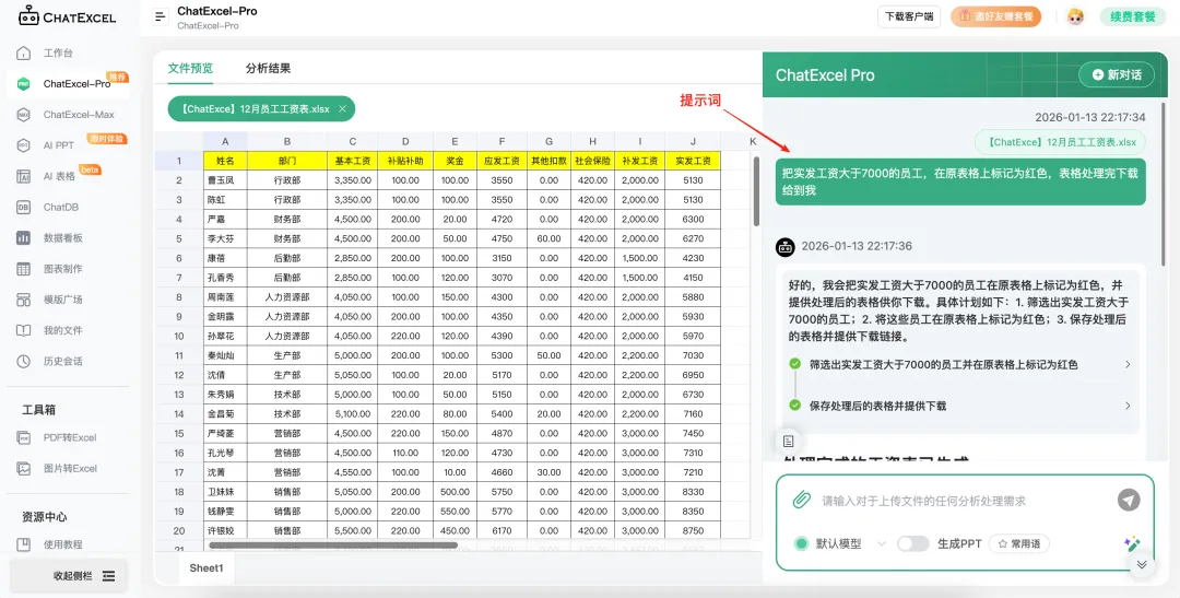 在对话框里输入提示词,比如在下面的这张图片中,我们在官网示例文件“12月员工工资表”旁的对话框输入:“把实发工资大于7000的员工,在原表格上标记为红色,表格处理完下载给到我”。然后ChatExcel就会思考并执行,这里有个小技巧:指令越具体,结果越准确,避免用“那些比较高的值”这种模糊表达。