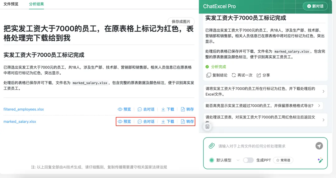 结果完成的非常好,所有工资超过7000元的员工AI都标注出来了,标注出来之后,我们下载或者继续提问。