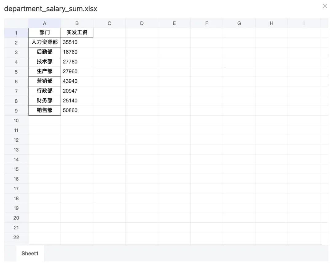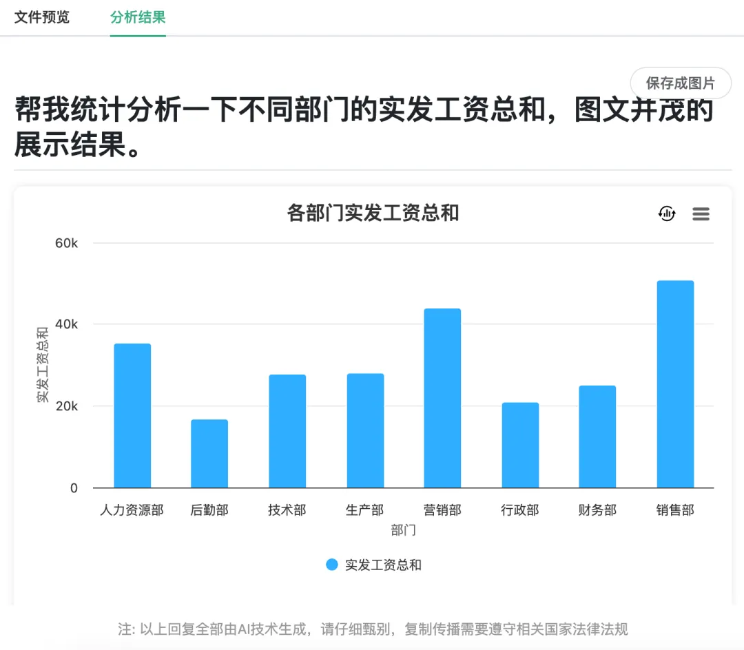 除了常规的Excel处理,我们还可以通过ChatExcel制作可视化图表,例如我们在“工资表”文件中输入:“帮我统计分析一下不同部门的实发工资总和,图文并茂的展示结果。”
