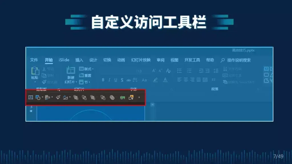 上图所列基本已覆盖日常使用最高频的工具,但是这些工具分布在“开始”、“插入”、“格式”等不同的二级菜单里,来回切换,十分麻烦!为了避免这种麻烦,PPT创造了“自定义访问工具栏”这个工具。