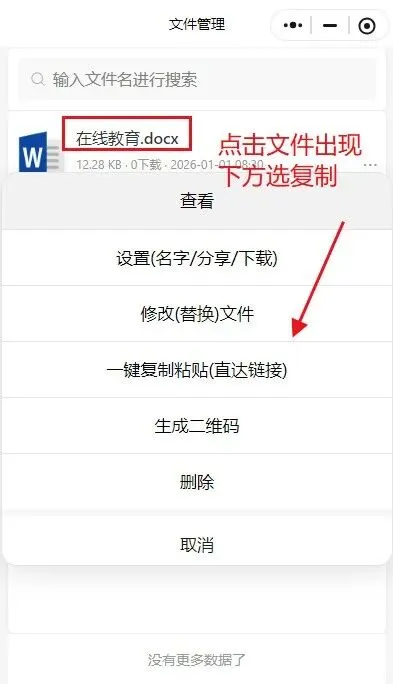 2.复制链接:文件上传成功后,返回首页进入【文件管理】。点击目标文件,进入在线查看页,依次点击【一键复制粘贴】【一键复制】,复制文件专属链接。