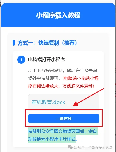 3.粘贴链接:切换至公众号图文编辑页,找到插入位置,粘贴文件链接。可搭配引导文案,读者点击即跳转微信正方文档小程序查看文档。