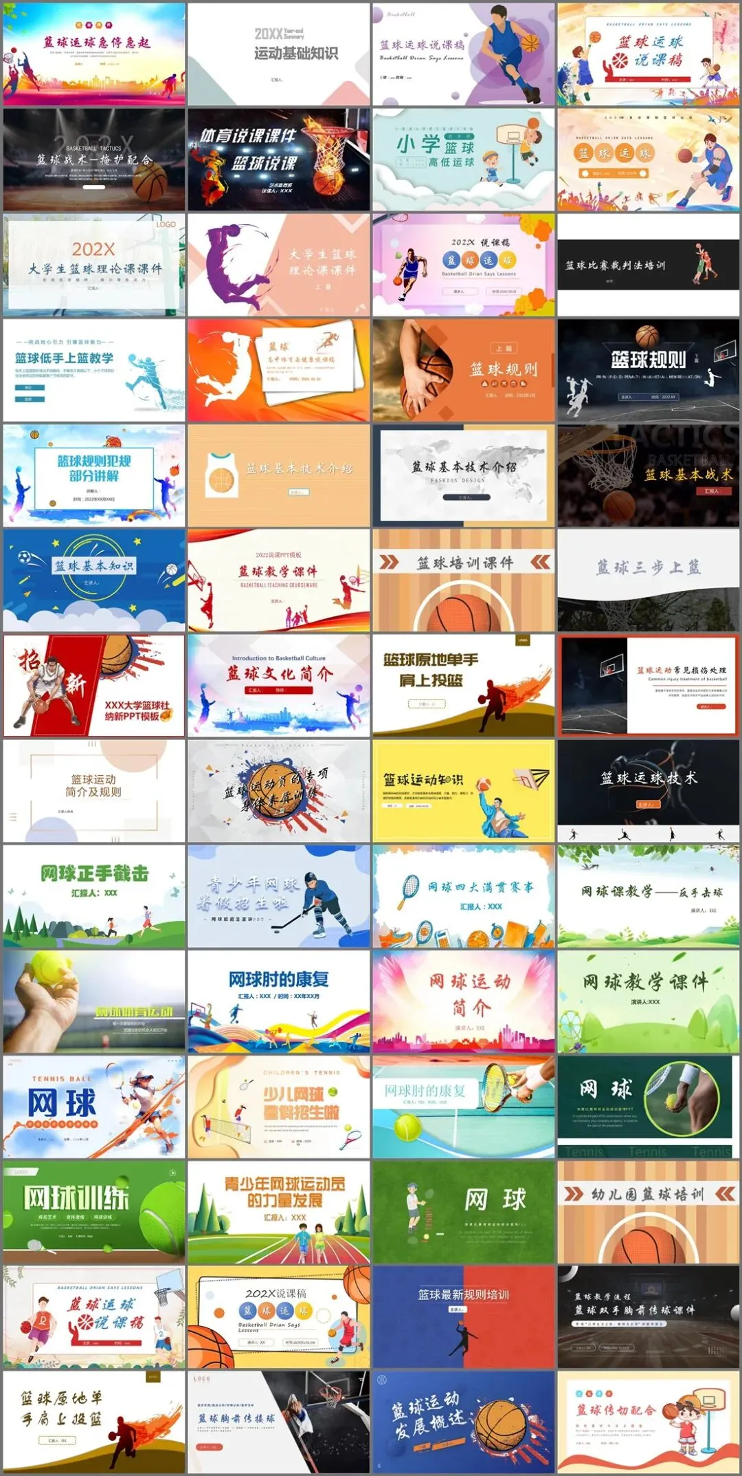 包括了:篮球运球急停急起PPT、运动基础知识PPT、篮球运球说课PPT、篮球战术PPT、小学篮球PPT、篮球理论课PPT、篮球低手上篮PPT、篮球规则PPT、篮球社招新PPT、网球正手截击PPT、网球课教学PPT、网球肘的康复PPT、网球运动简介PPT、篮球运动发展概述PPT等。