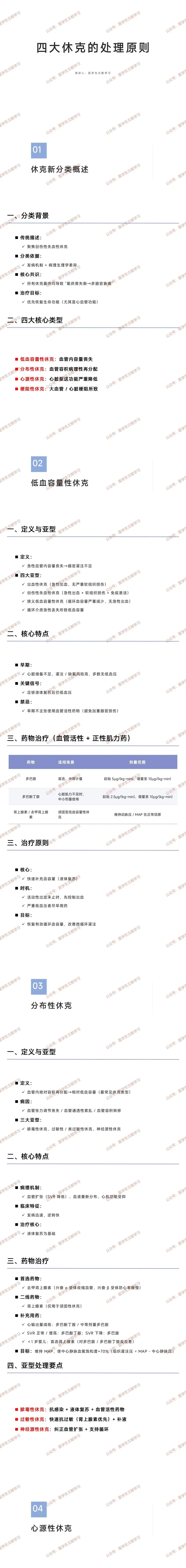 - 亚型要点:脓毒性休克需抗感染 + 补液 + 血管活性药物;过敏性休克优先用肾上腺素抗过敏 + 补液;神经源性休克纠正血管扩张 + 支持循环。
